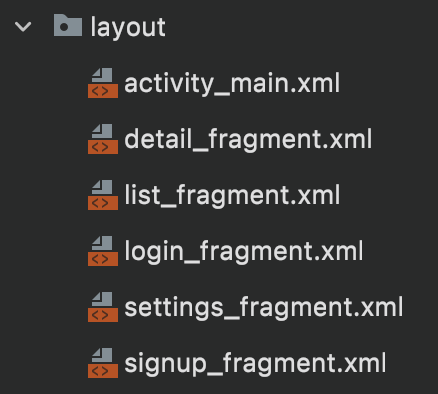 현재의 예정된 화면은 1. 로그인 2. 회원가입 3. 리스트 4. 디테일 5. 설정 총 5개다. 각각의 xml을 우선 만들어두자. 물론 아직 내용은 없이 xml과 디폴트 Fragment 클래스만 생성할 것이다.