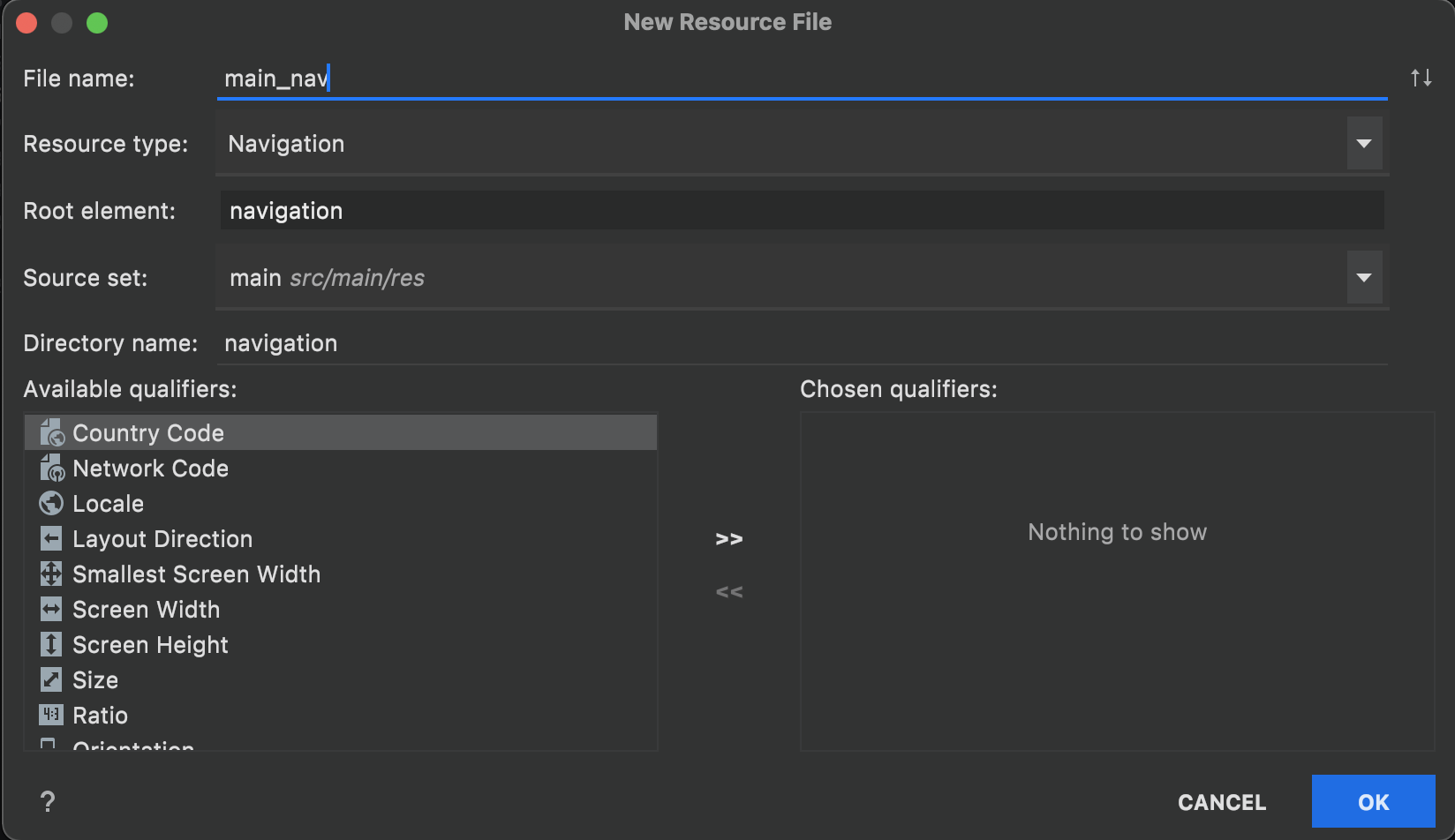 res 디렉토리에 Android Resource File을 추가해준다. 나는 이름을 main_nav라 짓고, 우선 로그인 <-> 리스트 <-> 디테일 이 메인 내비게이션을 설정해줄 것이다. 큰 줄기를 만든 후 나머지를 추가할 계획. 이때, Resource type을 Navigation 이라고 설정해주면 알아서 디렉토리를 만들어준다.