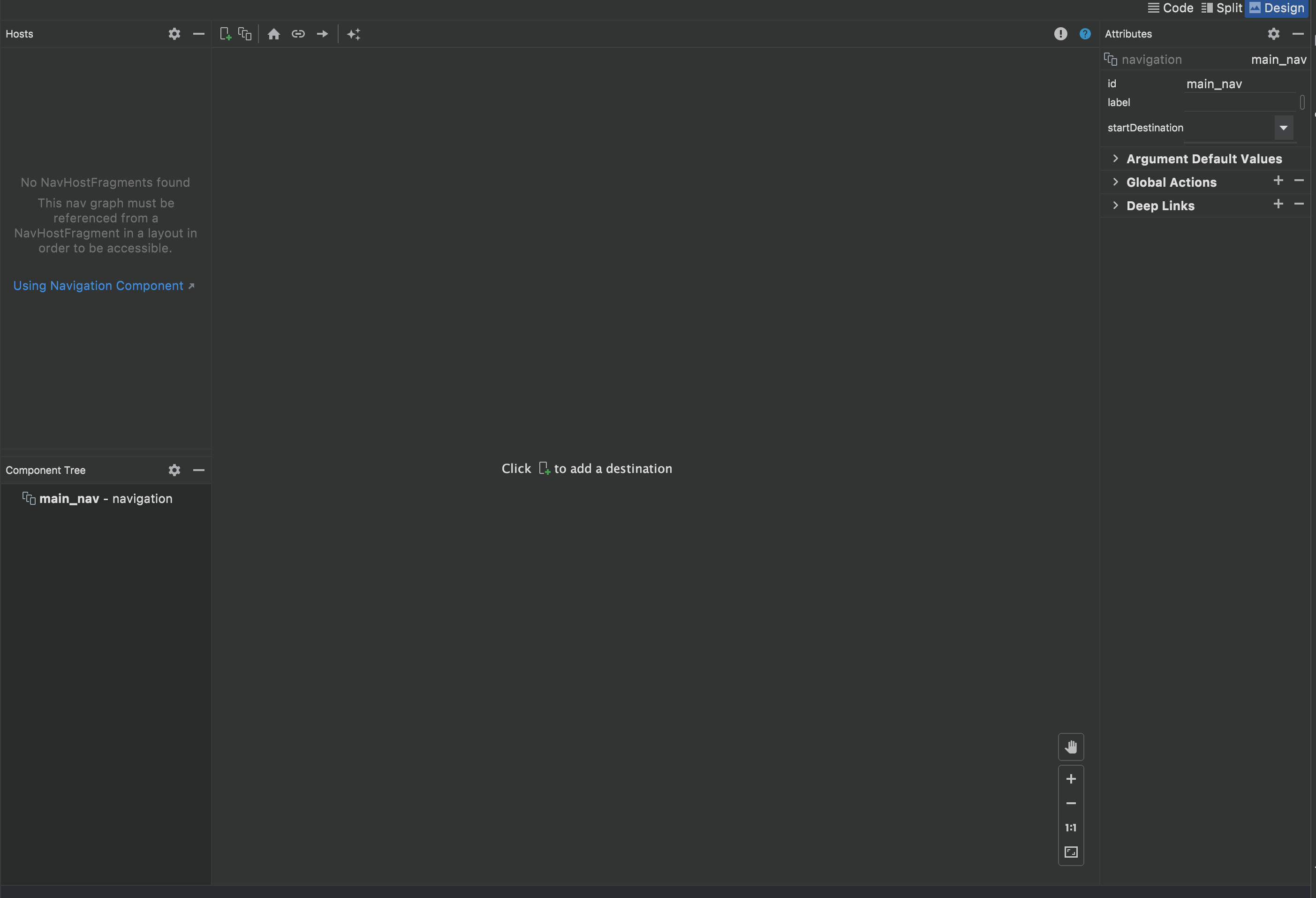 좌측 상단의 추가 버튼을 눌러, destination들을 추가해주도록 하자. 위에서 말하였듯 이 경우에는 LogInFragment, ListFragment, DetailFragment 세 가지를 추가해줄 것이다.